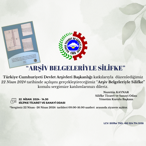 Türkiye Cumhuriyeti Devlet Arşivleri Başkanlığı katkılarıyla düzenlediğimiz 22 Nisan 2024 tarihinde açılışını gerçekleştireceğimiz “Arşiv Belgeleriyle Silifke” konulu sergimize katılımlarınızı dileriz.