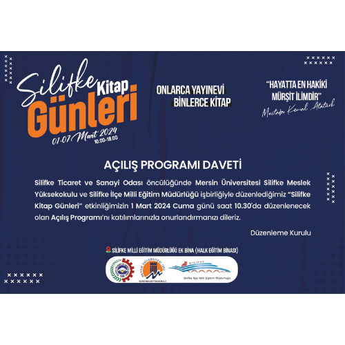 Silifke Ticaret ve Sanayi Odası öncülüğünde Mersin Üniversitesi Silifke Meslek Yüksekokulu ve Silifke İlçe Milli Eğitim Müdürlüğü işbirliğiyle düzenlediğimiz “Silifke Kitap Günleri” etkinliğimizin 1 Mart 2024 Cuma günü saat 10.30'da Milli Eğitim Ek Bina (Halk Eğitim Merkezi eski bina) düzenlenecek olan Açılış Programı’nı katılımlarınızla onurlandırmanızı dileriz.