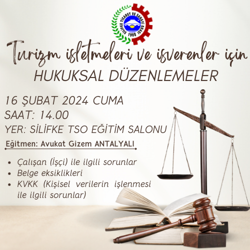 Turizm İşletmeleri ve İşverenler için “Hukuksal Düzenlemeler “ Eğitimi 16 Şubat Cuma günü Saat 14.00’da Silifke Ticaret ve Sanayi Odası Eğitim Salonunda gerçekleşecektir.