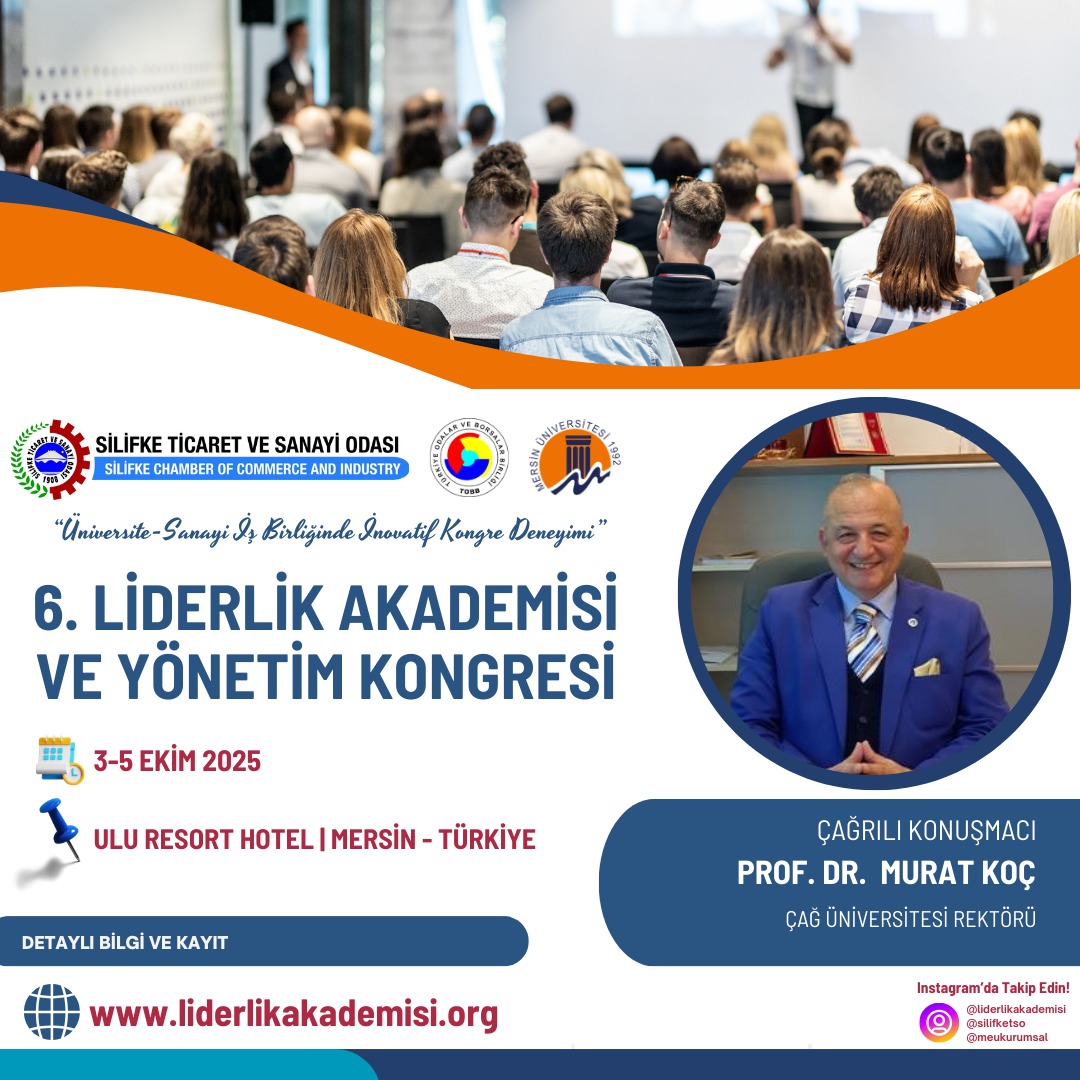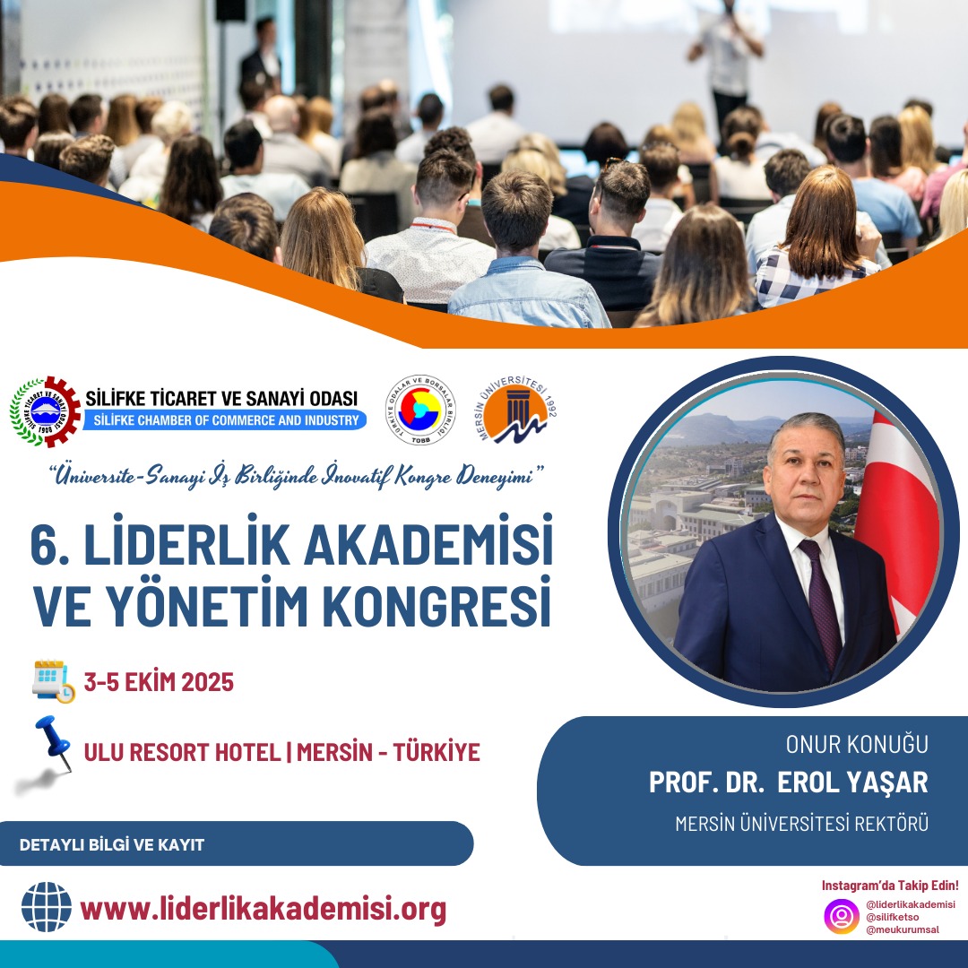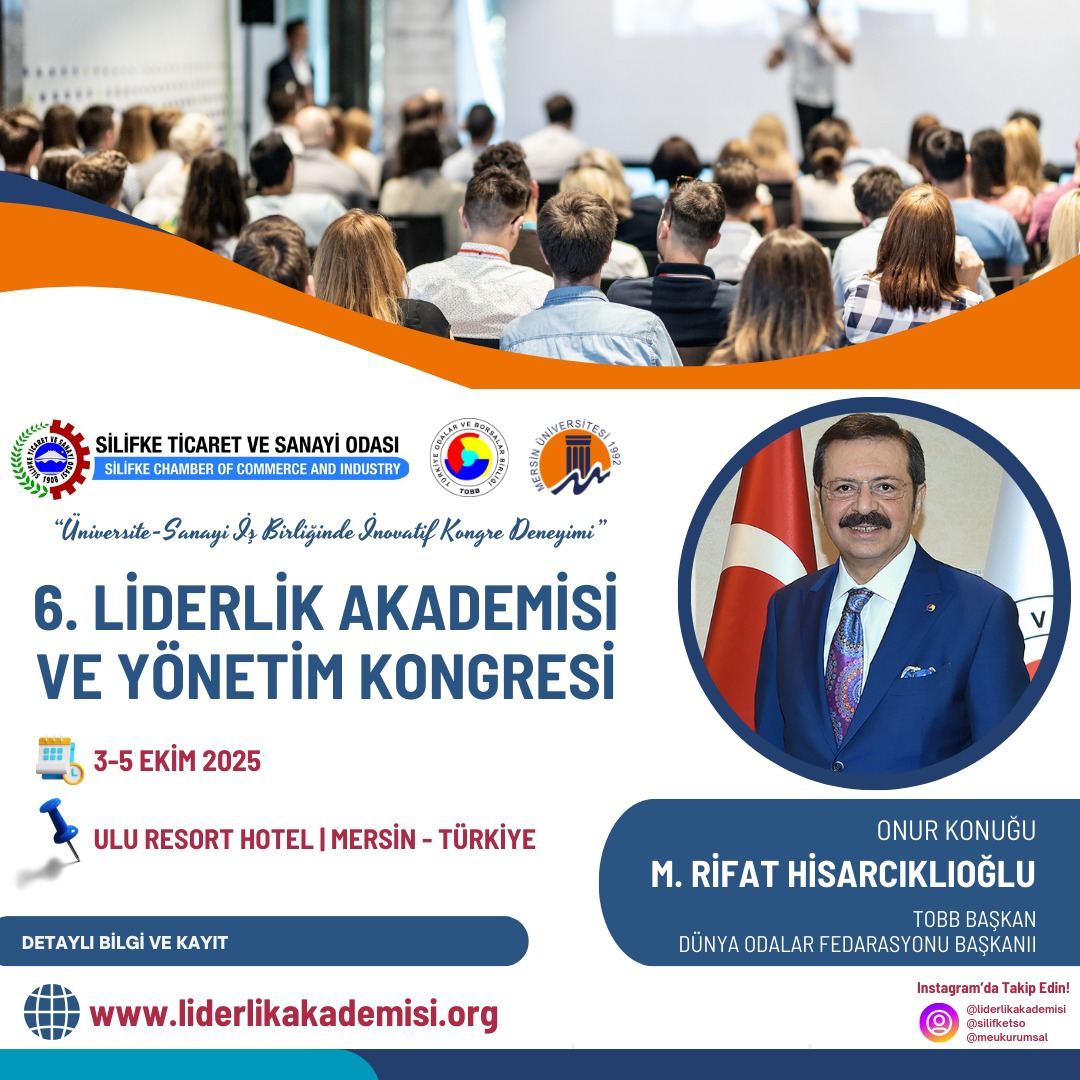 “Üniversite-Sanayi İş Birliğinde İnovatif Kongre Deneyimi” sloganıyla markalaşan 6. Liderlik Akademisi ve Yönetim Kongresi, Silifke Ticaret ve Sanayi Odası ve Mersin Üniversitesi işbirliğinde TOBB Ekonomi ve Teknoloji Üniversitesi, İstanbul Nişantaşı Üniversitesi, Toros Üniversitesi, Çağ Üniversitesi, Çukurova Kalkınma Ajansı ve Silifke Belediyesi katkılarıyla 3-5 Ekim 2025 tarihlerinde Ulu Resort Hotel – Mersin/Türkiye’de gerçekleştirilecektir.