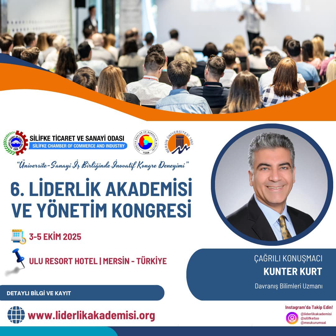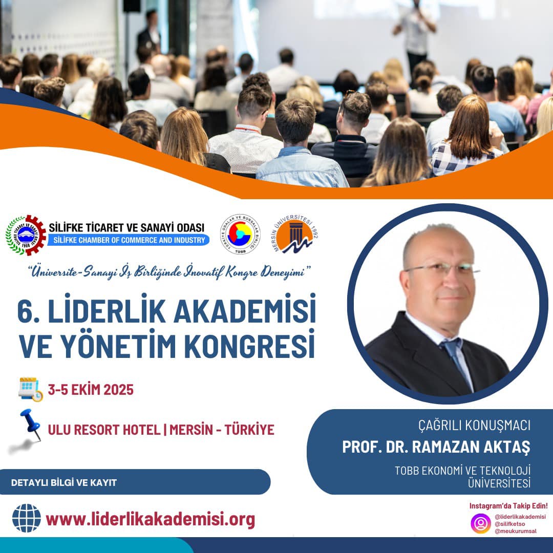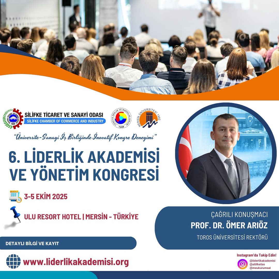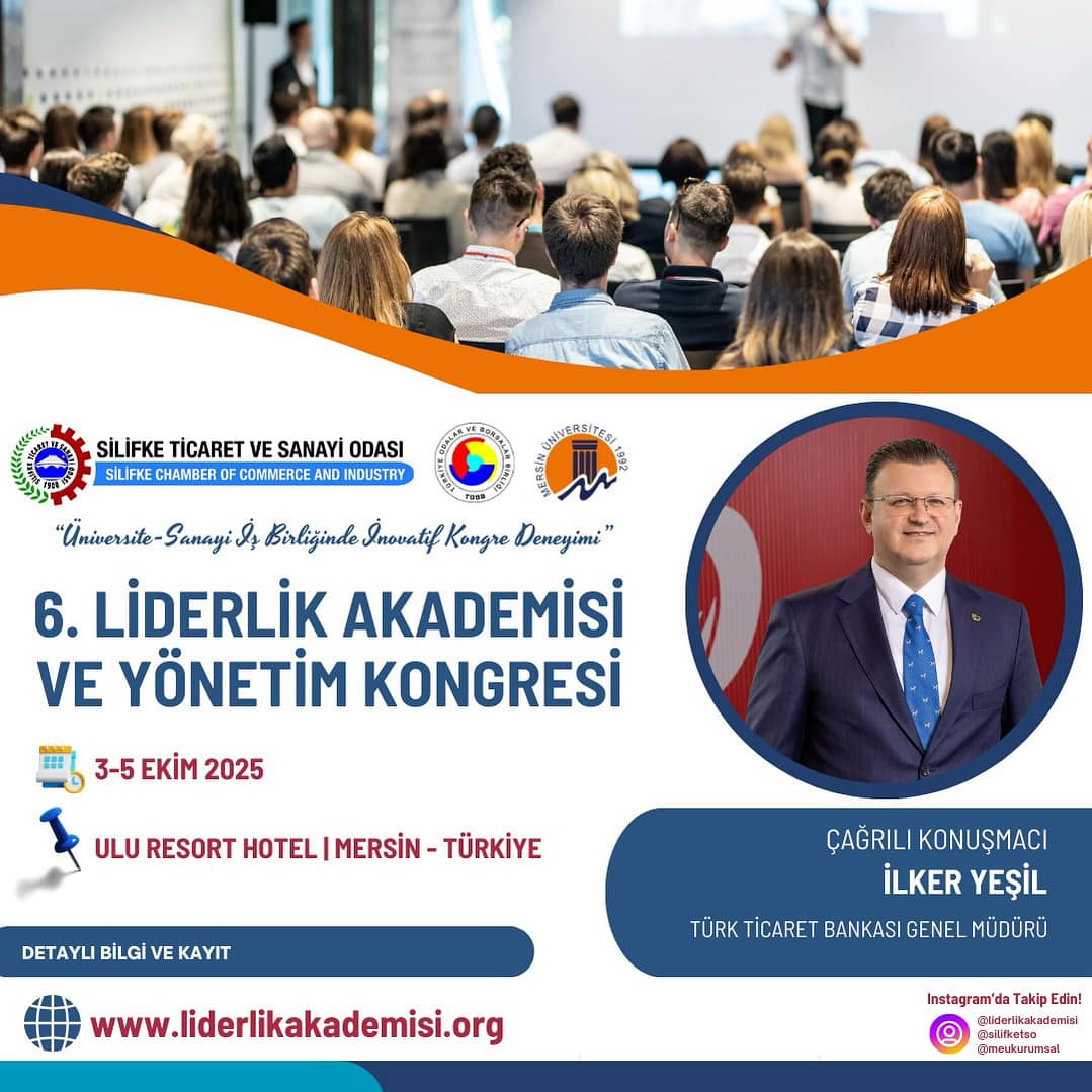 “Üniversite-Sanayi İş Birliğinde İnovatif Kongre Deneyimi” sloganıyla markalaşan 6. Liderlik Akademisi ve Yönetim Kongresi, Silifke Ticaret ve Sanayi Odası ve Mersin Üniversitesi işbirliğinde TOBB Ekonomi ve Teknoloji Üniversitesi, İstanbul Nişantaşı Üniversitesi, Toros Üniversitesi, Çağ Üniversitesi, Çukurova Kalkınma Ajansı ve Silifke Belediyesi katkılarıyla 3-5 Ekim 2025 tarihlerinde Ulu Resort Hotel – Mersin/Türkiye’de gerçekleştirilecektir.