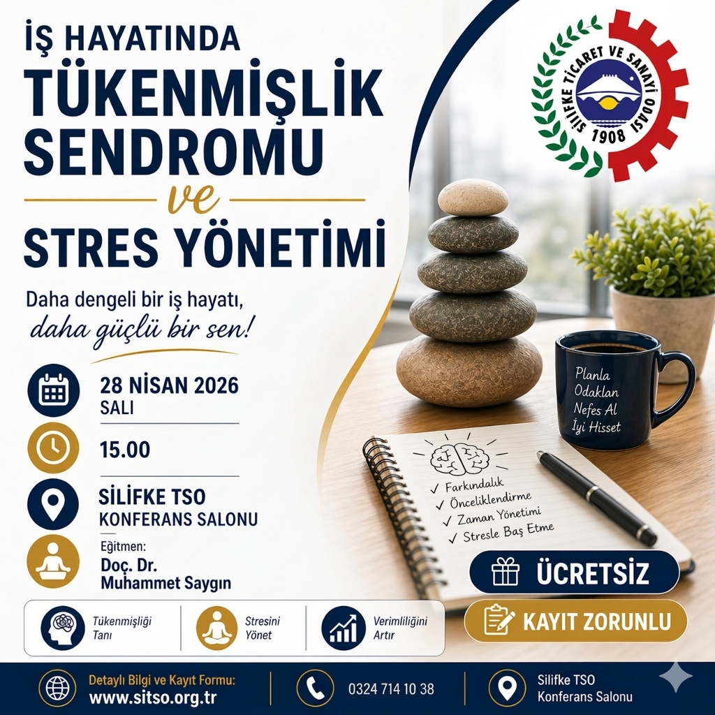Silifke Ticaret ve Sanayi Odası olarak, iş dünyasının en büyük zorluklarından biri olan tükenmişlik sendromuna karşı farkındalık yaratmak ve verimliliğinizi artırmak amacıyla düzenlediğimiz eğitimimize davetlisiniz.