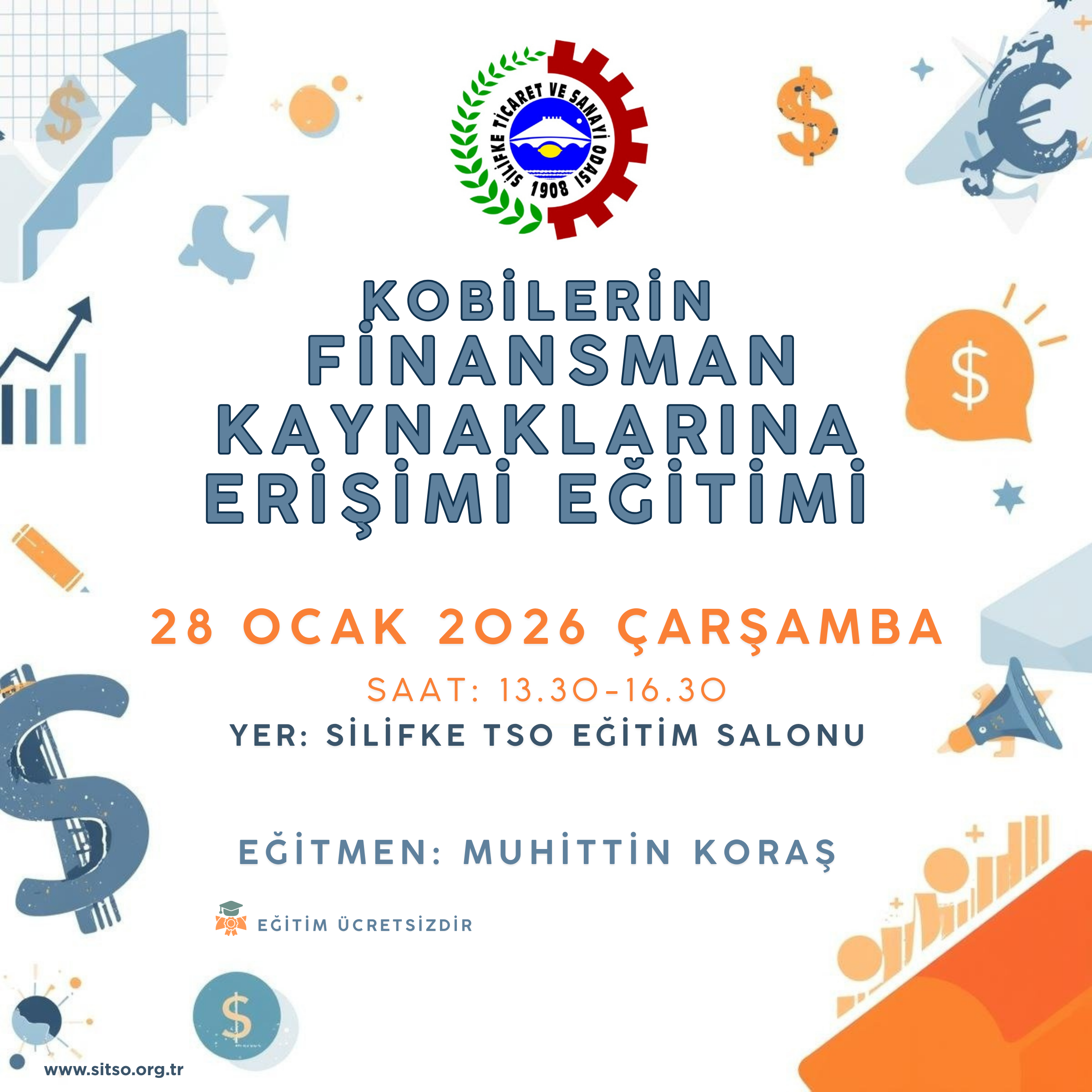 Silifke Ticaret ve Sanayi Odası olarak, üyelerimizin ve KOBİ’lerimizin finansmana erişim süreçlerine yönelik bilgi ve farkındalıklarını artırmak amacıyla “KOBİ’lerin Finansman Kaynaklarına Erişimi” konulu bir eğitim programı düzenliyoruz.